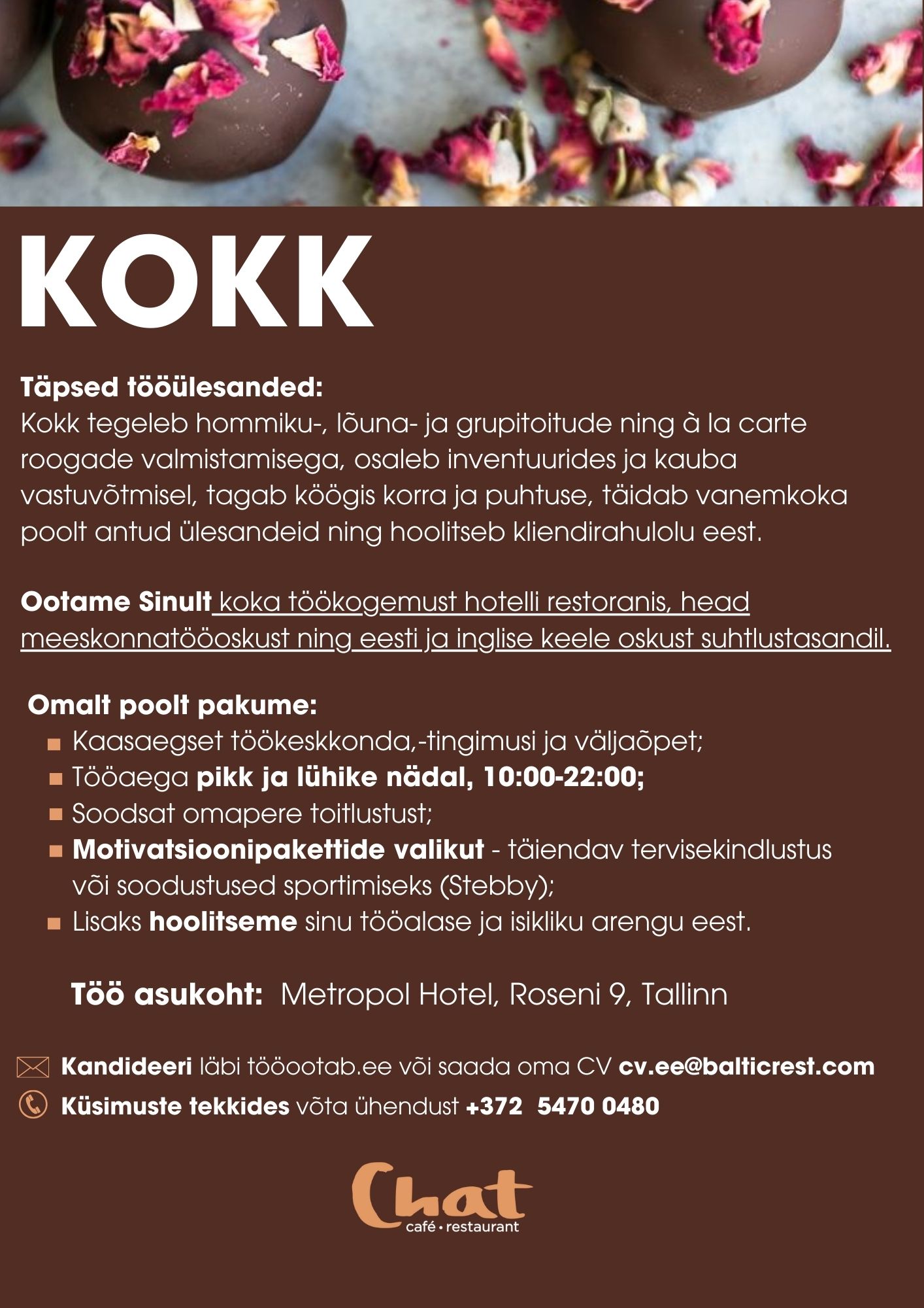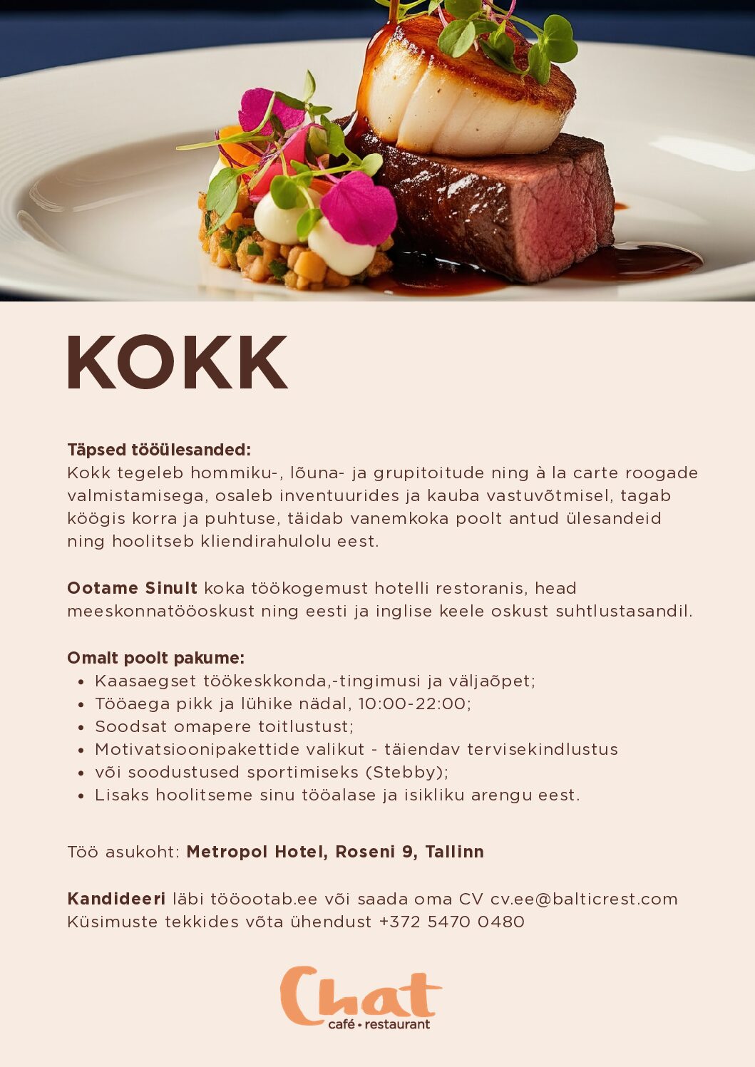 Ootame Sinult koka töökogemust hotelli restoranis, head meeskonnatööoskust ning eesti ja inglise keele oskust suhtlustasandil.