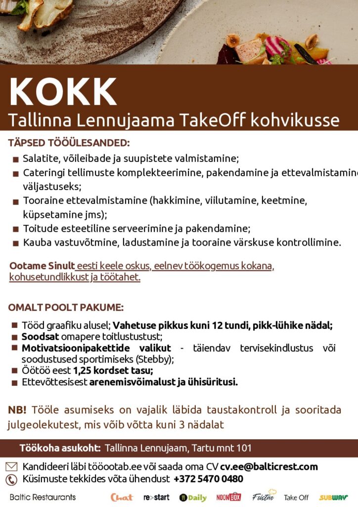 Ootame Sinult eesti keele oskus, eelnev töökogemus kokana, kohusetundlikkust ja töötahet.