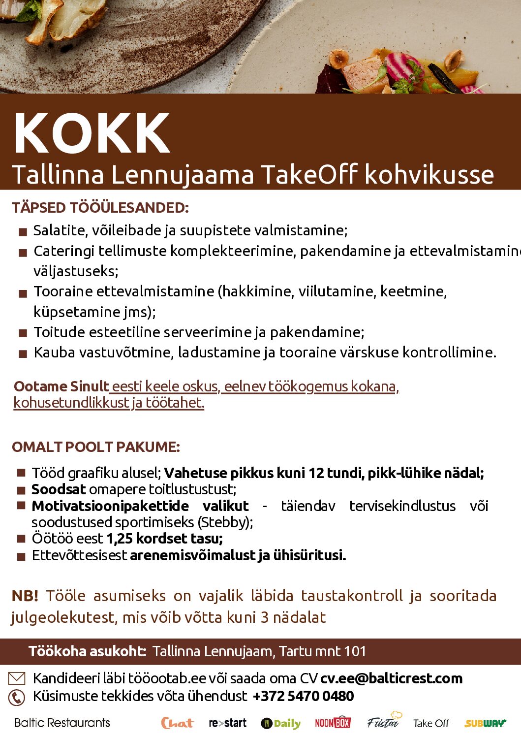 NB! Tööle asumiseks on vajalik läbida taustakontroll ja sooritada julgeolekutest, mis võib võtta kuni 3 nädalat